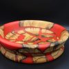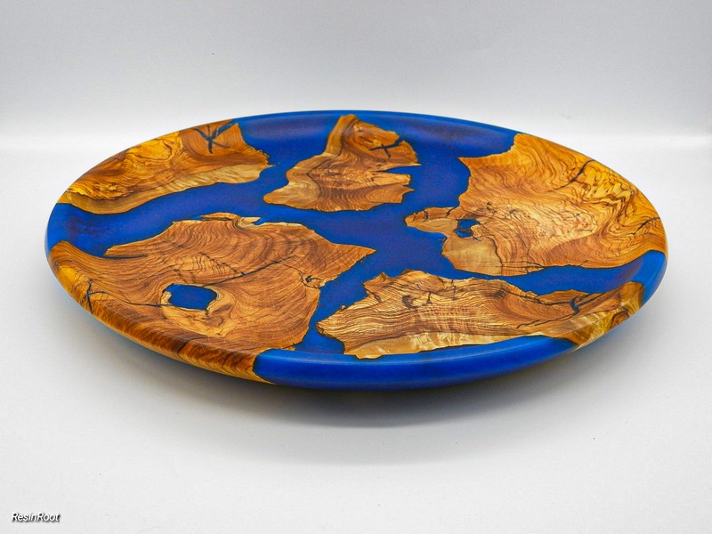 The image shows a beautiful, handmade resin bowl with a striking blue interior and natural wood accents. The bowl’s design features irregularly shaped pieces of light-coloured wood embedded in a vibrant blue resin, creating a visually appealing contrast. The wood has visible grain patterns and darker lines, adding texture and depth to the piece.